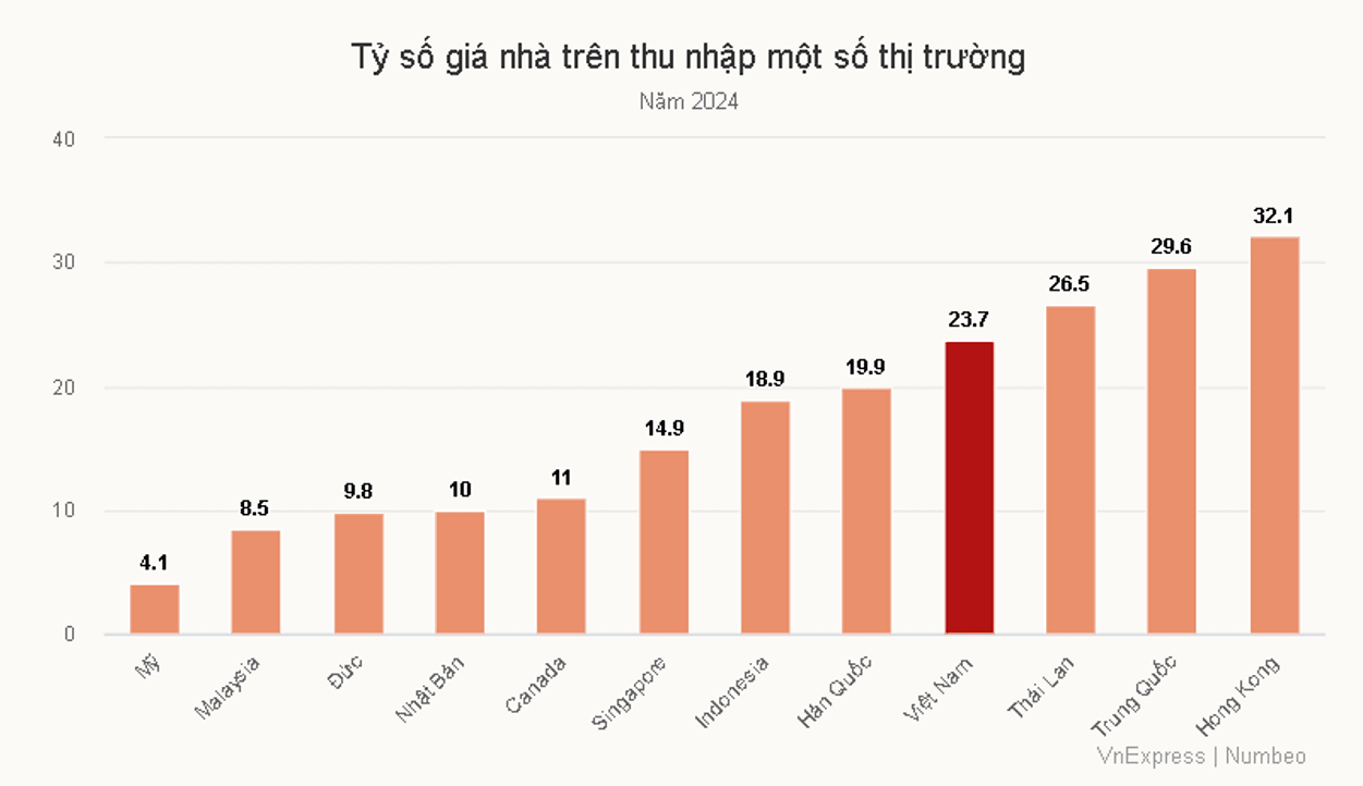 Một báo cáo so sánh gần đây cho thấy giá nhà trên thu nhập tại VN cao hơn bình quân thế giới khoảng 1,6 lần (PIR ~23–24), hiện nay chỉ số này là 26, nghĩa là nhà trở nên rất khó tiếp cận cho hộ gia đình trung bình. (nguồn: eonsr.com).